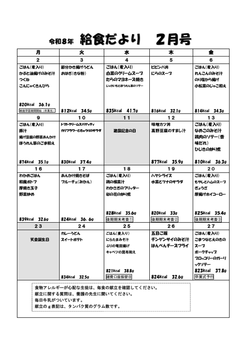 6月の給食献立です。食材の値上がりにより献立作りが大変です。